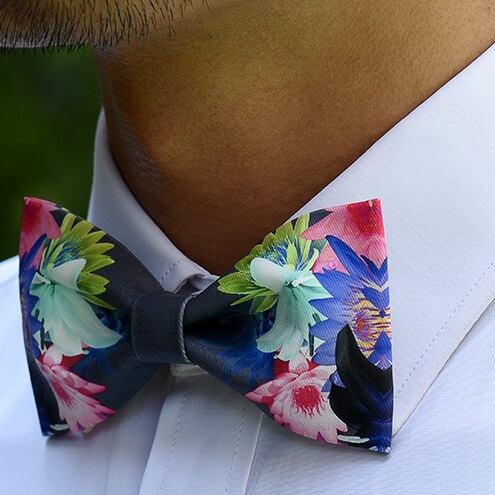 大柄の花柄をプリントしたボウタイ(蝶ネクタイ)です