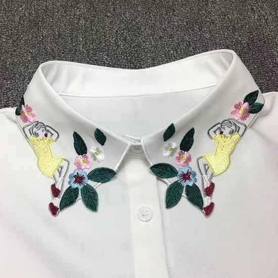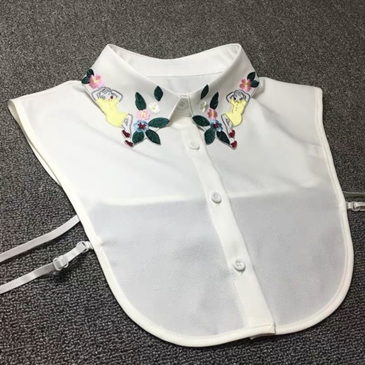 寝転んだ女の子とフラワー刺繍がユニークな付け襟です